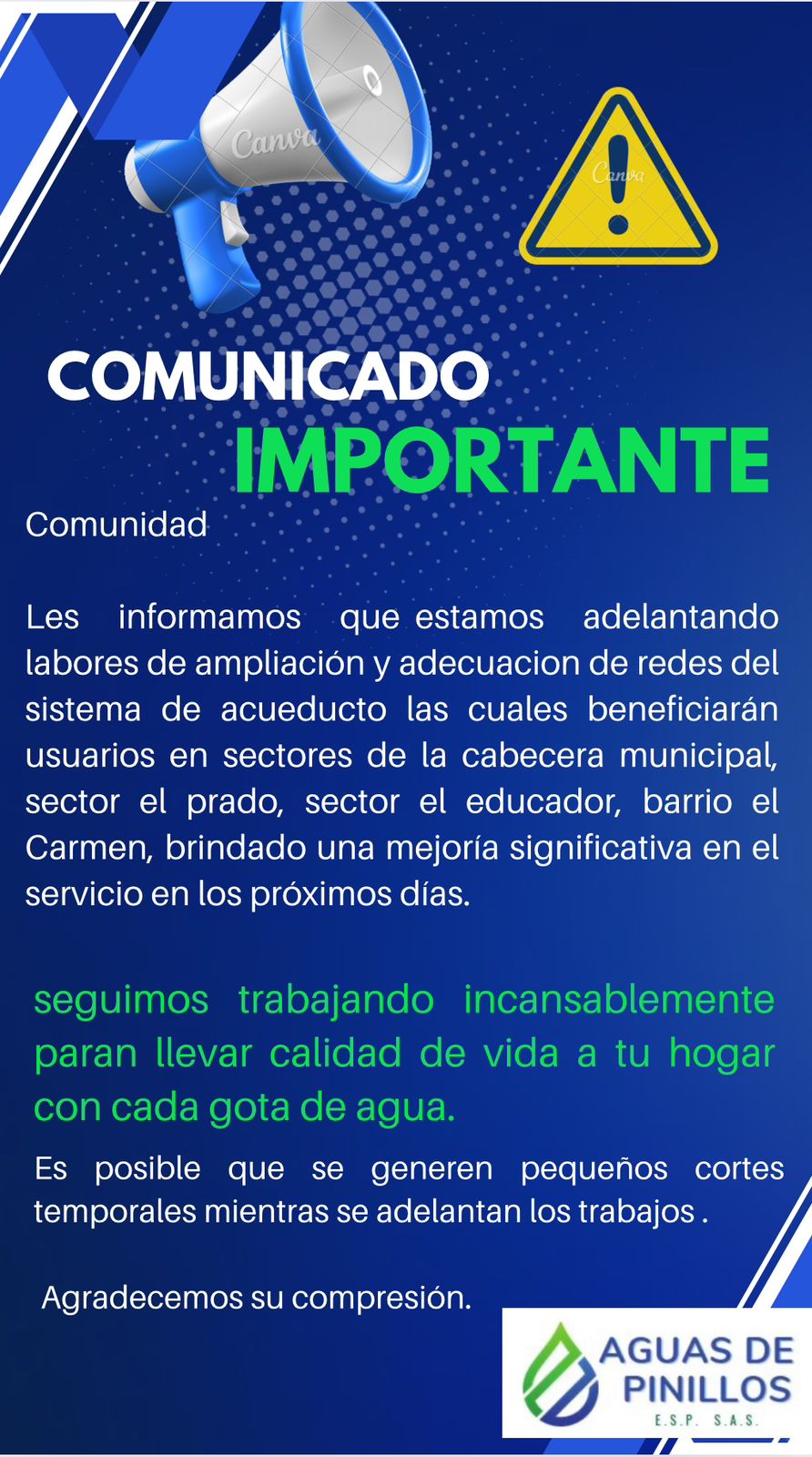 Les Informamos que estamos adelantando labores de ampliación y adecuación de redes del sistema de Acueducto las cuales beneficiaran usuarios en sectores de la cabecera municipal, sector el prado, sector el educador, barrio el Carmen, brindando una mejora significativa en el servicio en los los próximos días.